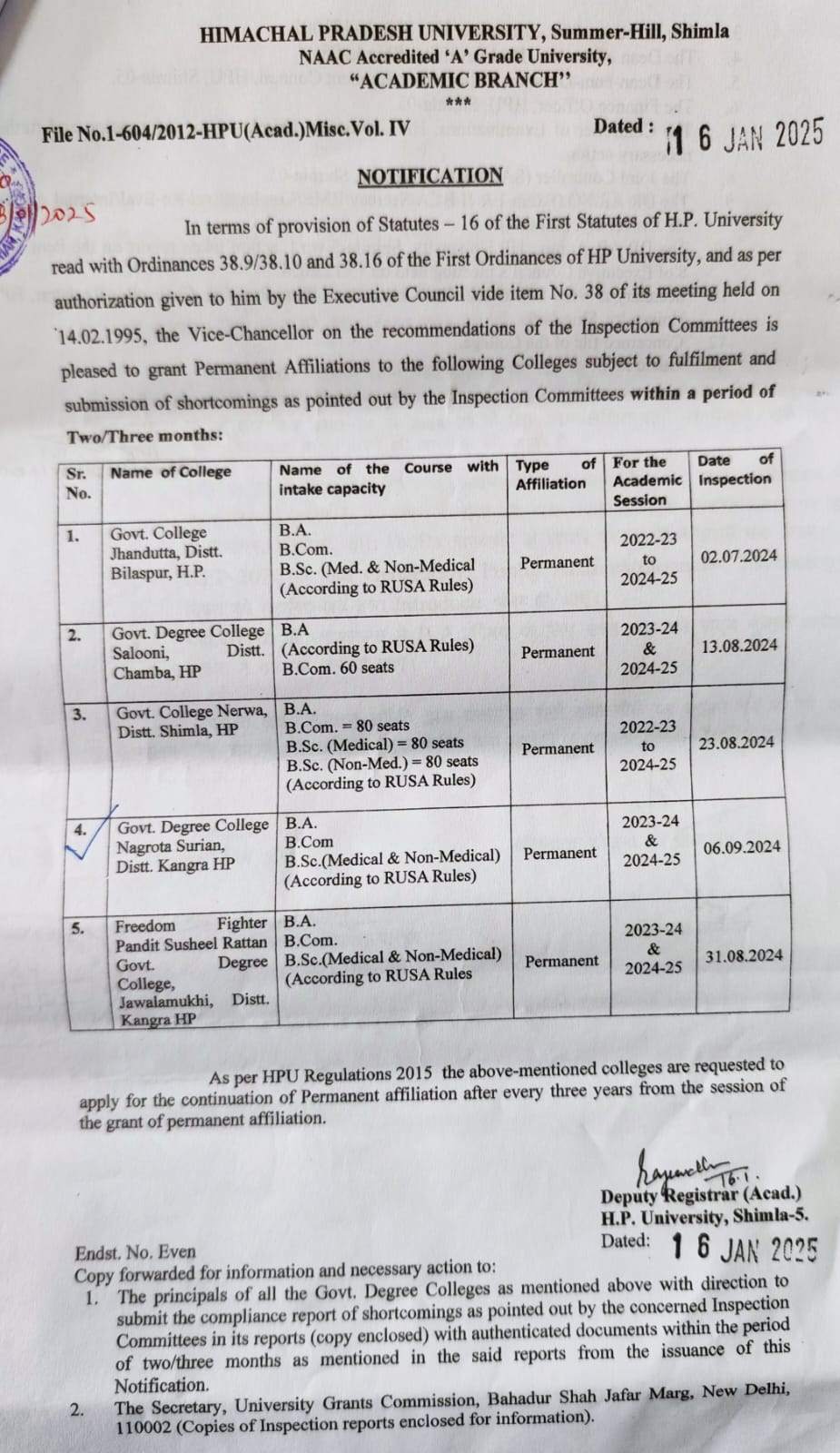 | 4 | BCA | 2024 | HPU Shimla | Temporary and LOA from AICTE |