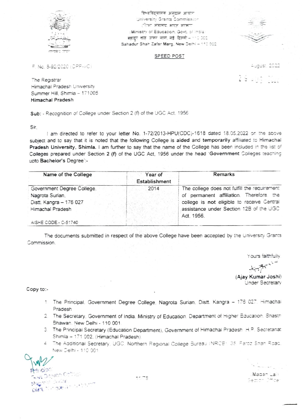 Government Degree College Nagrota Surian is recognized under Section 2(f) of the UGC Act, 1956.