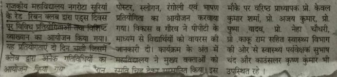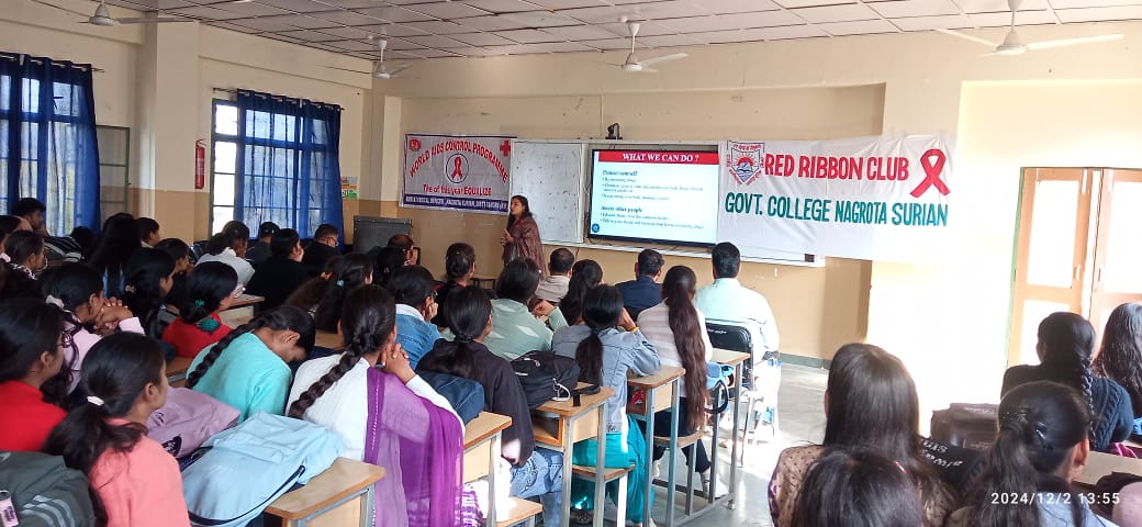 राजकीय महाविद्यालय नगरोटा सुरियाँ में दिंनाक 30/11/2024 को विभिन्न प्रतियोगिताओं का आयोजन किया ज्ञान जिसमे प्रतिभागीओं ने बढ़-चढ़ कर हिस्सा लिया | दिंनाक 02/12/2024 को भाषण प्रतियोगिता का आयोजन किया साथ ही पीपीटी द्वारा भी बच्चो को एड्स संबधी जानकारी दी | ज्वाली आए किशोर परामर्शदाता श्री कृष्ण कुमार व नगरोटा सुरियाँ स्वास्थ विभाग से स्वास्थ परामर्शदाता श्री सुरेश कुमार ने भी बच्चो को एड्स संबधी समस्याओं और साथ – साथ नशे से बचाव /दुरी जेसो विषयों पर जागरूक किया | इस एड्स संबधी कार्यक्रम से 138 बच्चे लाभान्वित हुए | दिंनाक 02/12/2024 को रेड रिबन क्लब के सदस्यों ने मानव श्रृंखला बनाकर भी बच्चों को ऐश विषय पर जागरूक किया |